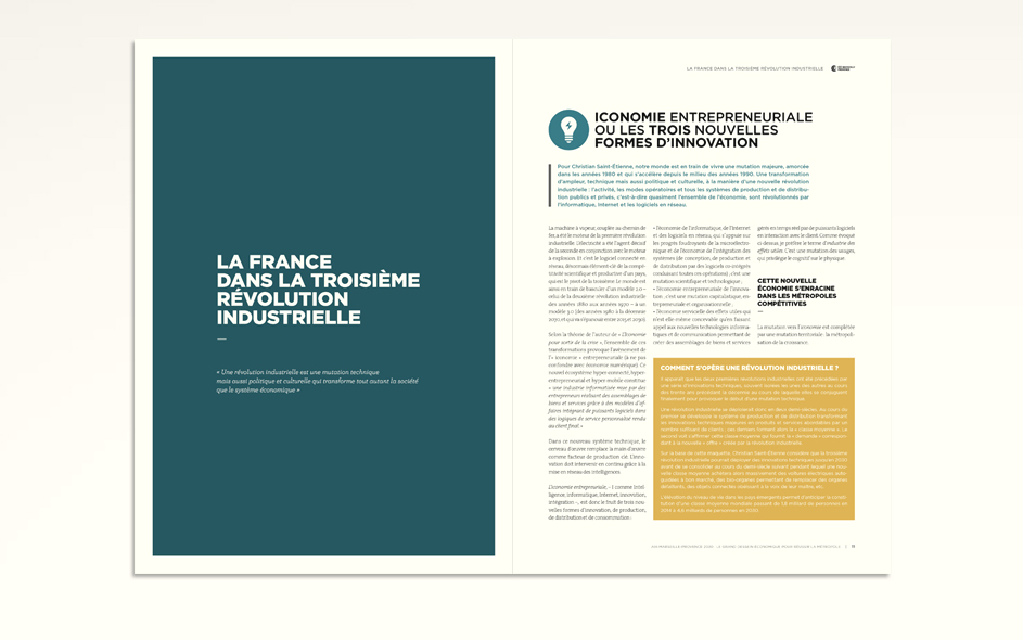 L’étude produite par Christian Saint Étienne a été guidée par trois objectifs : Comprendre la troisième révolution industrielle dans laquelle la métropole Aix-Marseille-Provence va évoluer dans les vingt prochaines années. Appréhender le phénomène de métropolisation de la croissance par lequel la croissance se concentre dans des métropoles dynamiques et attractives. Identifier les leviers de développement économique d’une métropole.