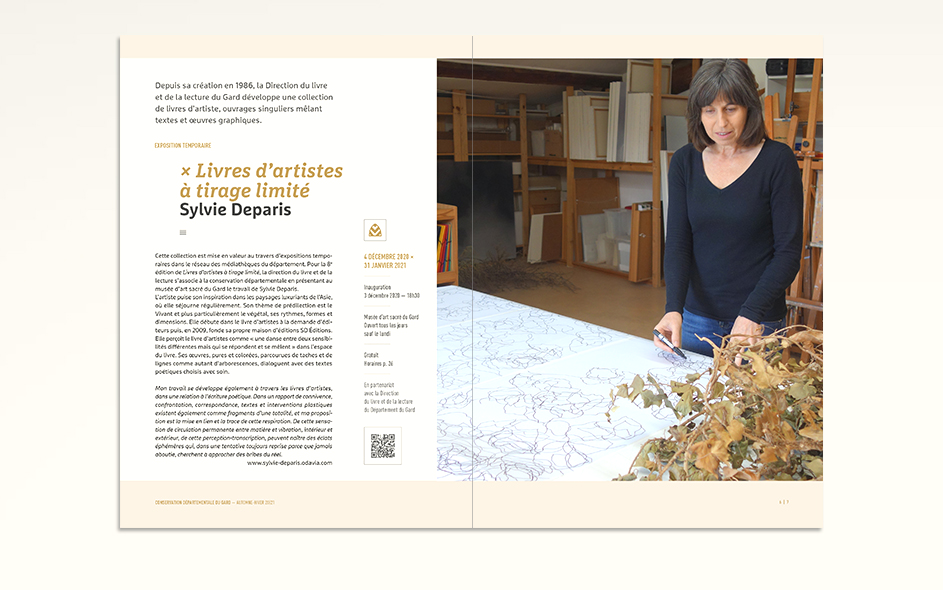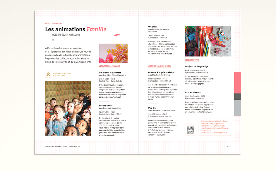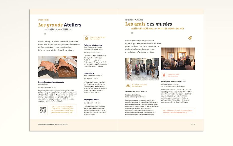 Jusqu’en 2022, la programmation culturelle de la conservation des musées du Gard était très riche et diversifiée. La conservation c’était un musée départemental situé à Pont-Saint-Esprit, deux musées à Bagnols-sur-Cèze et un musée à Villeneuve-les-Avignon. Chaque année, 4 à 6 expositions temporaires, des événements nationaux (journées du patrimoine, nuits des musées, nuits de la lecture, …), des ateliers, des conférences toutes les semaines, un cycle en biennale, des jeux et activités découvertes pour les enfants de tous âges, des visites thématiques, des coopérations diverses… La conservation ne disposait jusque là d’aucun support transversal permettant d’avoir une vue globale sur la totalité de sa programmation. Cette nouvelle brochure semestrielle, véritable outil de développement du territoire, aura le mérite de mettre en avant le travail des équipes du département autant que d’attirer encore plus de visiteurs tout en fidélisant les habitués.