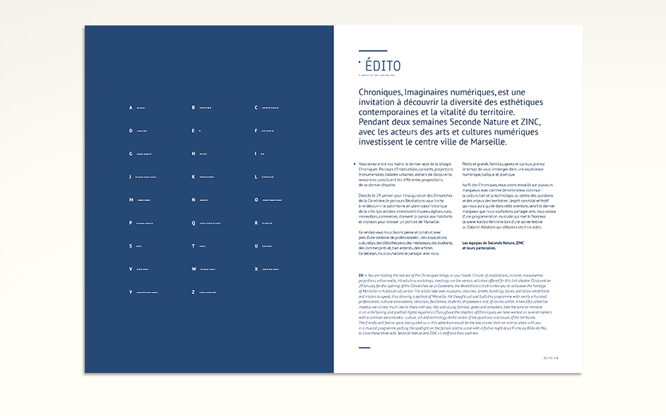 Chroniques, Imaginaires numériques, est une invitation à découvrir la diversité des esthétiques contemporaines et la vitalité du territoire. Pendant deux semaines Seconde Nature et ZINC, avec les acteurs des arts et cultures numériques investissent le centre ville de Marseille. Le parcours Révélations vous invite à re-découvrir le patrimoine en plein cœur historique de la ville. Les artistes investissent musées, églises, rues, immeubles, commerces, donnent la parole aux habitants et visiteurs pour dresser un portrait de Marseille. Ce rendez-vous a été pensé et construit avec près d’une centaine de professionnels ; des associations culturelles, des bibliothécaires, des médiateurs, des étudiants, des commerçants et, bien entendu, des artistes. Au fil des Chroniques, nous avons travaillé sur plusieurs marqueurs avec comme dénominateur commun : la culture, l’art et la technologie au centre des questions et des enjeux des territoires.