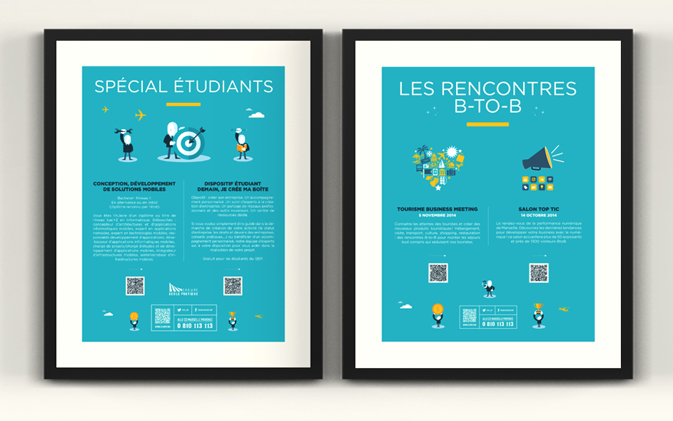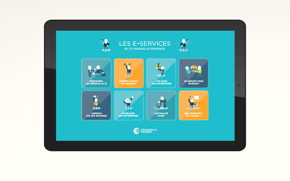 A l’occasion de « La Foire de Marseille » et ensuite du « Salon des Entrepreneurs Marseille Provence » la CCI Marseille Provence a souhaité mettre en avant son investissement dans la numérisation et la création de nouveaux services en lignes aux entreprises du territoire. Nous avons créé un série d’affiches et une webapp centralisant tous les services. Ciblé pour une audience large, la campagne se veut didactique et se déploie autour d’un personnage d’entrepreneur bonhomme avec pour volonté de faciliter l’utilisation de l’outil. Ce dispositif est aujourd’hui généralisé à tous les points d’accueil sous la nouvelle bannière « CCI Business » et un outil de gestion en permet la customisation en fonction des thématiques à mettre en avant.