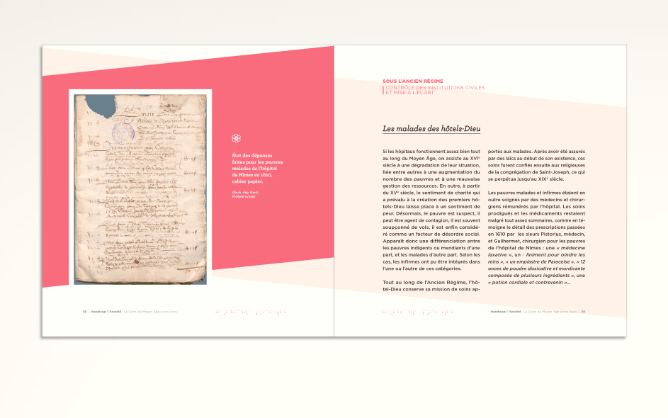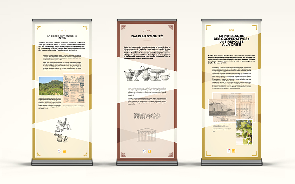 Les Archives départementales du Gard mettent en place de petites expositions documentaires itinérantes sur la base de leur fonds. L’ensemble signalétique sous forme de banners est aussi reproduit sur de petits catalogues gratuits. Les thématiques sont nombreuses et toujours finement choisies pour une vulgarisation d’intérêt pour le grand public et les jeunes gardois. L’histoire de la viticulture avec Bacchus au pays des Archives, Figures gardoises pour découvrir ces gardois qui ont fait le monde au-delà du territoire, Handicap et sociétés, Cartes et territoires ou encore Parcs et jardins du Gard…