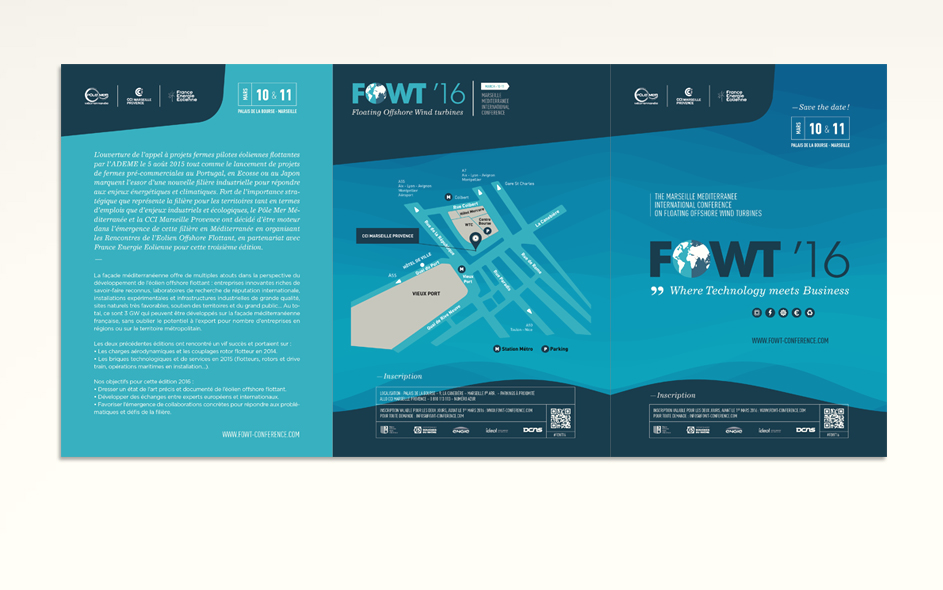 Le Pôle Mer Méditerranée et la CCIMP ont décidé de participer à leurs niveaux à l’émergence en région de l’Eolien Offshore Flottant, filière et spécialisation d’avenir. Pour leur 3e édition de la « Marseille Méditerranée International Conference on Floating Offshore Wind Turbines » ils désiraient se doter d’une ligne graphique afin de renforcer leur communication. Leurs cibles : les laboratoires spécialisés ; les PME/PMI, ETI et start-up innovantes ; les grandes entreprises participant déjà à un ou plusieurs projets pilotes. Les objectifs : renforcer l’idée d’expertise et la dimension internationale de l’événement. Nous avons décidé de simplifier l’acronyme, sa définition, son explication ; d’y apposer une baseline claire sur les objectifs. Nous sommes volontairement sortis de l’imagerie « éolienne » pour travailler dans un univers d’ondes bleues.